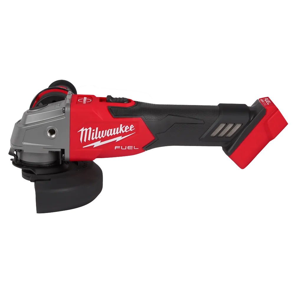 The MILWAUKEE® M18 FUEL™ 4-1/2″ / 5″ Grinder Slide Switch, Lock-On is the next advancement in power and performance, generating 11A corded power, fastest cutting, and delivering up to 135 cuts per charge. The M18 FUEL™ 4-1/2″ / 5″ Grinder generates 11A corded power allowing completion of the toughest grinding and cutting applications, all on the M18™ cordless system. The POWERSTATE™ Brushless Motor delivers maximum sustained power and 8,500 RPM to remove material faster and increase productivity. REDLINK PLUS™ Intelligence ensures unmatched levels of performance, protection, and compatibility. The RAPIDSTOP™ Brake stops all accessories in 2 seconds or less. The M18 FUEL™ 4-1/2″ / 5″ Grinder includes an electronic clutch for kickback protection, as well as overload protection to maximize motor life. The M18™ REDLITHIUM™ HIGH OUTPUT™ XC6.0 Batteries (not included) deliver 50% more power while running 50% cooler than our M18™ REDLITHIUM™ XC Batteries and are compatible with 200+ Tools in the M18™ System. Experience faster accessory changes and less downtime with tool-free accessory and guard adjustments while remaining fully compatible with the most common accessories in the market. The M18 FUEL™ 4-1/2″ / 5″ Grinder takes cordless grinders to the next level in performance and run-time.
