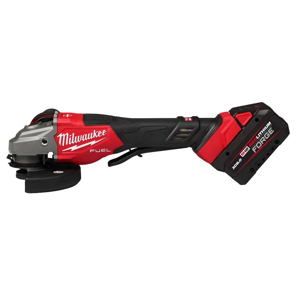 The MILWAUKEE® M18 FUEL™ 4-1/2″ / 6″ Braking Grinder Paddle Switch, No Lock is the next advancement in power and performance, generating 13A corded power, fastest cutting, and delivering up to 135 cuts per charge. The M18 FUEL™ 4-1/2″ / 6″ Braking Grinder generates 13A corded power allowing you to complete the toughest grinding and cutting applications, all on the M18™ Cordless System. The POWERSTATE™ Brushless Motor delivers maximum sustained power and 9,000 RPM to remove material faster and increase productivity. REDLINK PLUS™ Intelligence ensures unmatched levels of performance, protection, and compatibility. The RAPIDSTOP™ Brake provides stop times under 2 seconds with an abrasive disc. The M18 FUEL™ 4-1/2″ / 6″ Braking Grinder includes an electronic clutch for kickback protection, as well as overload protection to maximize motor life. The M18™ REDLITHIUM™ FORGE™ XC8.0 Battery Pack for HIGH OUTPUT™ HD12.0 power in a smaller size, and longest life vs. REDLITHIUM™ batteries. The M18 FUEL™ 4-1/2″ / 6″ Braking Grinder takes cordless grinders to the next level in performance and run-time.