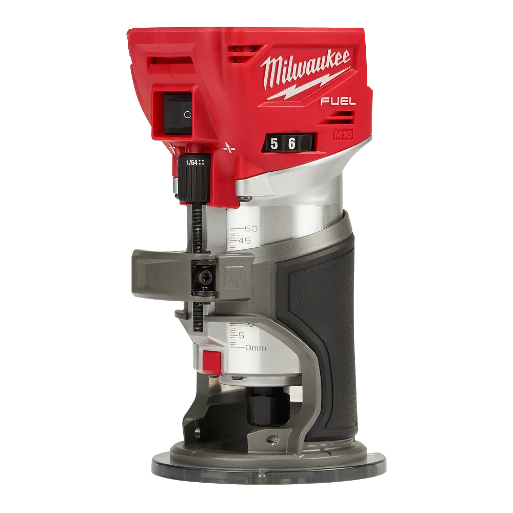 The MILWAUKEE® M18 FUEL™ Compact Router combines power, speed and accurate depth adjustments to deliver clean accurate cuts in a variety of materials and applications. The compact router uses the POWERSTATE™ Brushless Motor and REDLINK PLUS™ electronics. This delivers the power of corded 1.25 horsepower trim routers and 31,000 RPM, giving the power and speed for clean, quality cuts in hard materials. With an M18™ REDLITHIUM™ XC5.0 battery, the cordless compact router cuts up to 250ft of 3/8″ roundovers in red-oak, providing all-day run time with fewer trips to the charger. The handheld router has a micro-adjust dial and macro-adjust button, providing fast and accurate depth adjustments for highly accurate work. A variable-speed dial with speed from 10,000 to 31,000 RPM delivers control in all applications. The compact router also features a sturdy 4″ sub-base plate for stability, and dual-LED lights illuminate work surfaces. The M18 FUEL™ Compact Router is compatible with a plunge base and an offset base (sold separately).