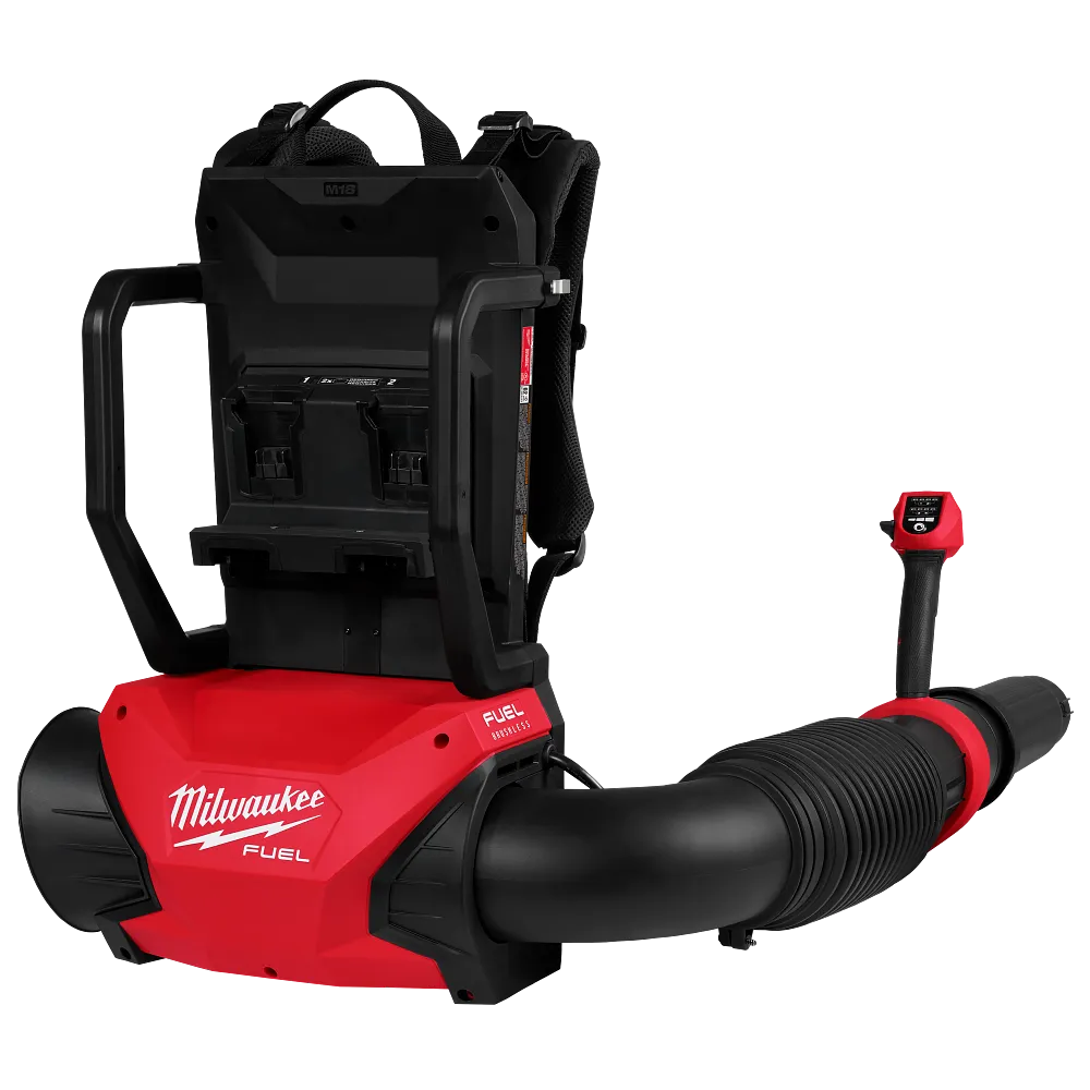 The MILWAUKEE® M18 FUEL™ Dual Battery Backpack Blower is designed for the outdoor trades, delivering a higher blowing force than up to 60cc gas. The POWERSTATE™ Brushless Motor Delivers a constant 650 CFM, 155 MPH, and 20.5 Newtons of blowing force and reaches full throttle in under one second, boosting productivity and control. The blower requires (2) M18™ REDLITHIUM™ Batteries for operation while providing (2) additional battery terminals to extend runtime. When using the recommended (4) M18™ REDLITHIUM™ HIGH OUTPUT™ 12.0 Batteries (not included), the blower delivers 30 to 60 minutes of continuous use based on the selected mode. This adjustable battery setup allows the operator to adapt the number of batteries for either lighter weight in quicker clean-ups or longer runtime in extended clearing applications. With a customizable battery configuration combined with a fully adjustable harness, mode select, telescoping nozzle, variable speed trigger, and low noise level of just 62dB(A), this backpack blower provides the most adaptive design and comfort to meet the wide range of application and operator needs. The M18 FUEL™ Dual Battery Backpack Blower is part of the M18™ System, fully compatible with over 250+ solutions.