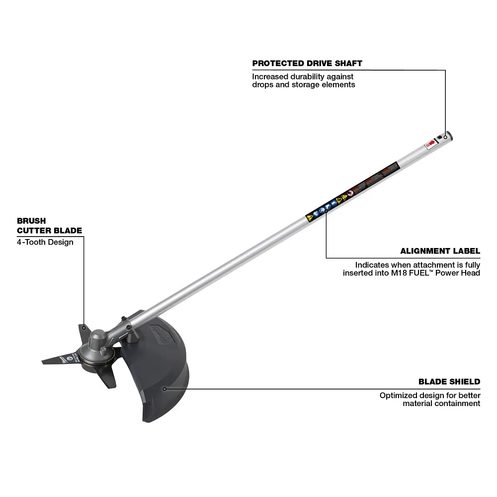 The MILWAUKEE® M18 FUEL™ QUIK-LOK™ Brush Cutter Attachment is powered by the MILWAUKEE® M18 FUEL™ Power Head w/ QUIK-LOK™ and is compatible with the split boom M18 FUEL™ QUIK-LOK™ Attachment System. The split shaft Brush Cutter Attachment utilizes a 9″ blade with a 4-tooth design, meant to take on more demanding applications. The Brush Cutter Attachment has an optimized guard design for the best material containment. Milwaukee M18 FUEL QUIK-LOK™ Attachments feature protected drive shafts for increased durability against drops and storage elements. The Brush Cutter Attachment also utilizes optimized gearing to manage the cordless MILWAUKEE® M18 FUEL™ Power Head RPM output specifically for brush cutting applications.