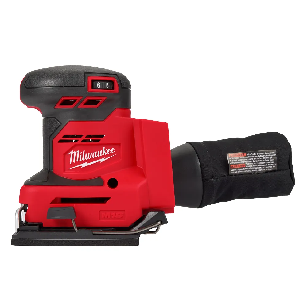 Designed for the professional carpenter, remodeler, and general contractor; The MILWAUKEE® M18 Orbital 1/4 Sheet Sander is optimized for performance and productivity on the jobsite. The Milwaukee M18 Orbital 1/4 Sheet Sander offers unmatched power at 13K Max OPM and class-leading dust collection to replace your corded unit. The low vibration and ergonomics of the tool deliver enhanced comfort and user control to reduce fatigue. The two-step clamp system allows for quick and easy sandpaper changes. The variable speed dial offers adjustment from 13K to 11K OPM for precise removal throughout a wide variety of materials. The dust collection system paired with Milwaukee Tool’s durable dust bag or universal hose adapter reduces clean-up time and provides a cleaner work environment.