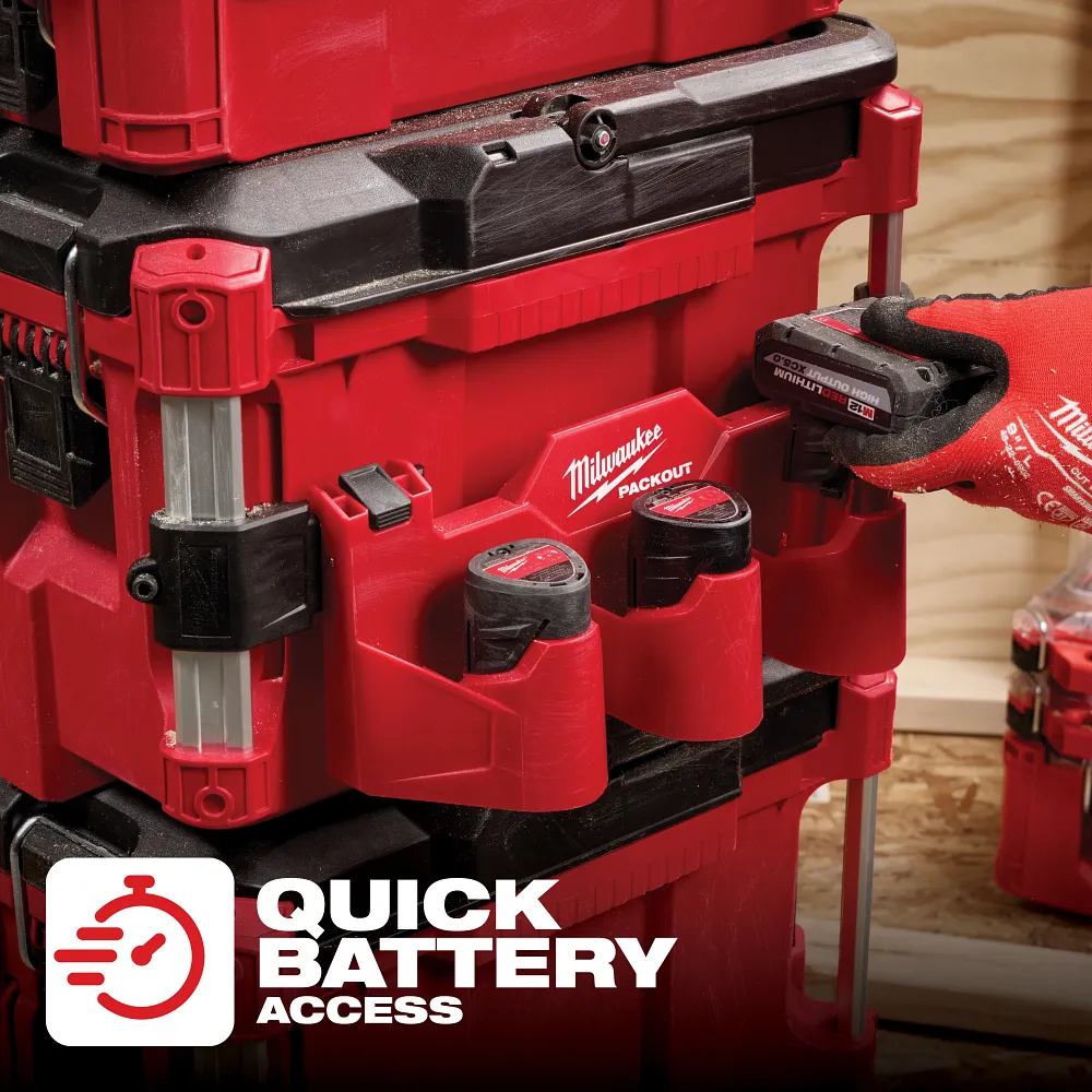 The MILWAUKEE® PACKOUT™ Tool Box M12™ Battery Rack Attachment delivers quick access to batteries while on the jobsite.  Fully customize your tool box with the ability to mount your M12™ Batteries to the outside of your stack. Additionally, the impact-resistant body offers maximum durability in any condition. PACKOUT™ is the industry’s most versatile and durable modular storage system.
