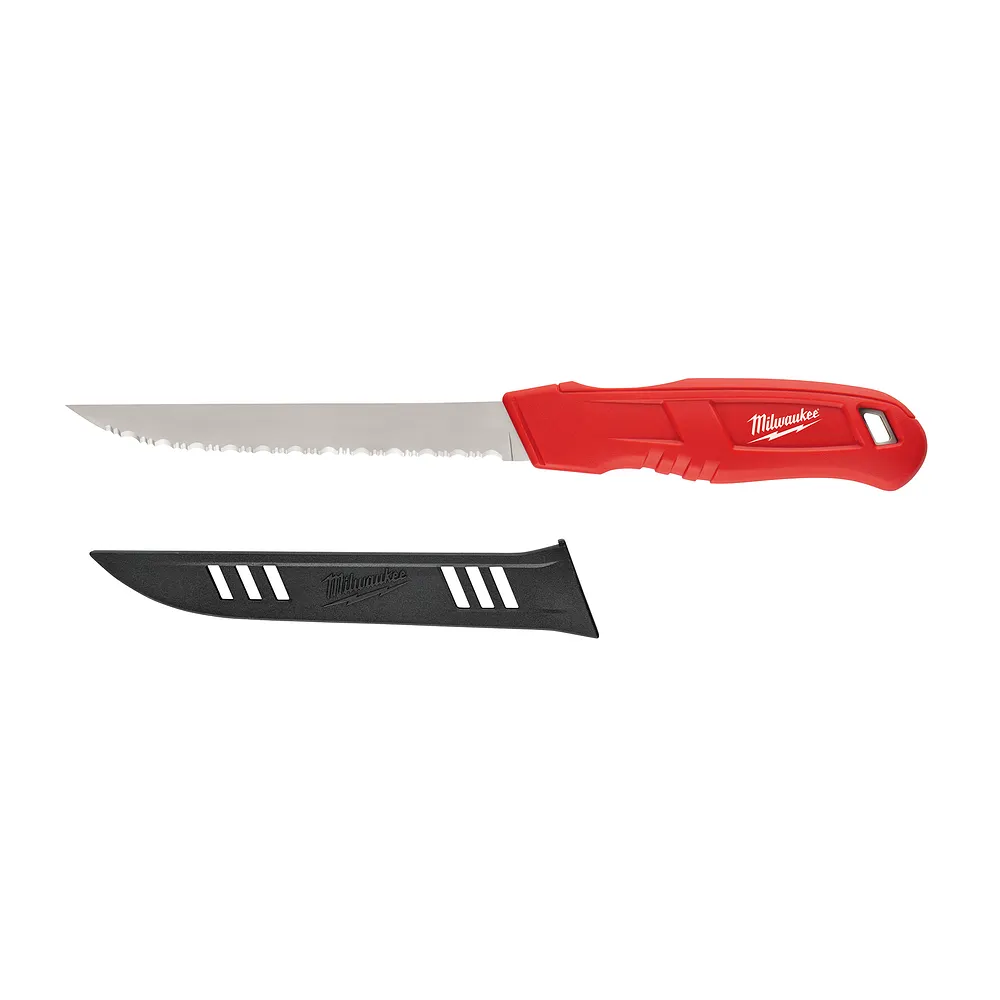 The Milwaukee® serrated insulation knife is designed for optimal edge retention and durability. The stainless steel blade is engineered to stay sharper up to 2X longer when cutting mechanical and HVAC insulation. A full metal tang provides durability for tough cuts and the rounded handle allows for smoothing tapes and adhesive laps. Includes a durable blade cover for storage.