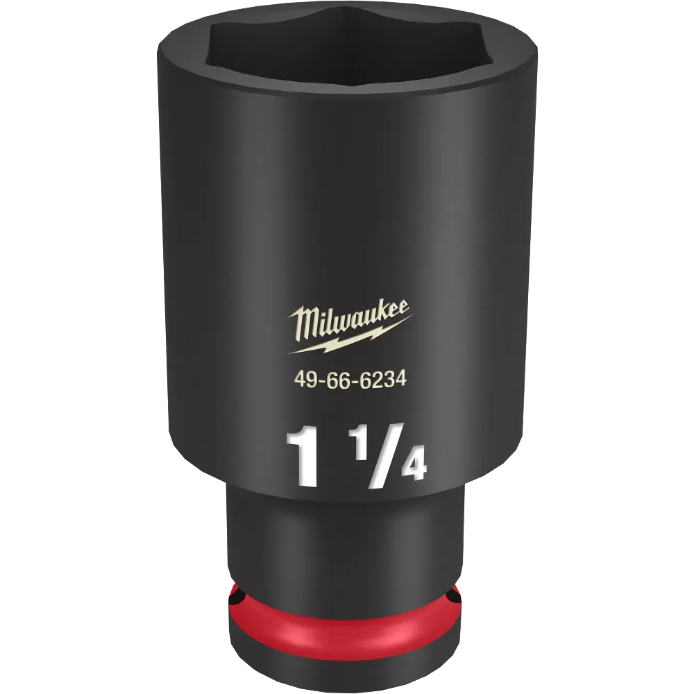 The MILWAUKEE® SHOCKWAVE Impact Duty™ 1/2″ Drive 1-1/4″ Deep 6-Point Socket features the boldest, longest-lasting markings and extreme impact durability in high torque applications. The stamped and ink-filled size marking enables an accurate socket selection every time throughout the life of the socket. Engineered with high-strength forged steel for optimized performance in heavy-duty applications, and a non-slip hex geometry prevents fastener rounding. The dual-hole design and ring groove allow for easy socket attachment and removal. All SHOCKWAVE Impact Duty™ Sockets are backed by a Lifetime Guarantee and meet ASME industry standards.