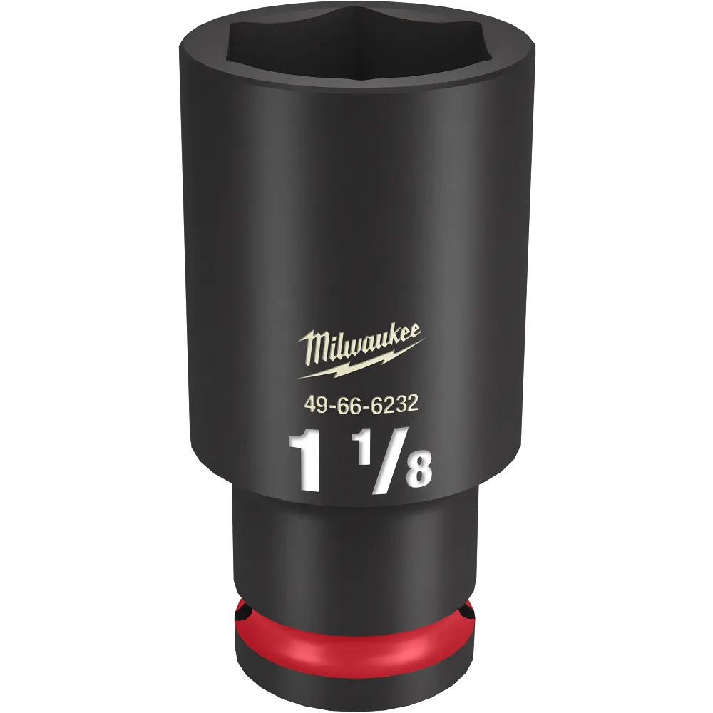 The MILWAUKEE® SHOCKWAVE Impact Duty™ 1/2″ Drive 1-1/8″ Deep 6-Point Socket features the boldest, longest-lasting markings and extreme impact durability in high torque applications. The stamped and ink-filled size marking enables an accurate socket selection every time throughout the life of the socket. Engineered with high-strength forged steel for optimized performance in heavy-duty applications, and a non-slip hex geometry prevents fastener rounding. The dual-hole design and ring groove allow for easy socket attachment and removal. All SHOCKWAVE Impact Duty™ Sockets are backed by a Lifetime Guarantee and meet ASME industry standards.