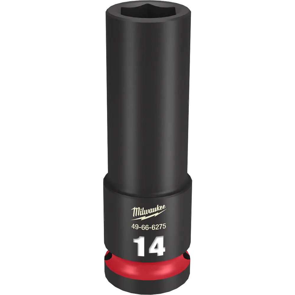 The MILWAUKEE® SHOCKWAVE Impact Duty™ 1/2″ Drive 14MM Deep 6 Point Socket features the boldest, longest-lasting markings and extreme impact durability in high torque applications. The stamped and ink-filled size marking enables an accurate socket selection every time throughout the life of the socket. Engineered with high-strength forged steel for optimized performance in heavy-duty applications, and a non-slip hex geometry prevents fastener rounding. The dual-hole design and ring groove allow for easy socket attachment and removal. All SHOCKWAVE Impact Duty™ Sockets are backed by a Lifetime Guarantee and meet ASME industry standards.