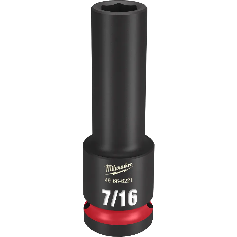 The MILWAUKEE® SHOCKWAVE Impact Duty™ 1/2″ Drive 7/16″ Deep 6-Point Socket features the boldest, longest-lasting markings and extreme impact durability in high torque applications. The stamped and ink-filled size marking enables an accurate socket selection every time throughout the life of the socket. Engineered with high-strength forged steel for optimized performance in heavy-duty applications, and a non-slip hex geometry prevents fastener rounding. The dual-hole design and ring groove allow for easy socket attachment and removal. All SHOCKWAVE Impact Duty™ Sockets are backed by a Lifetime Guarantee and meet ASME industry standards.