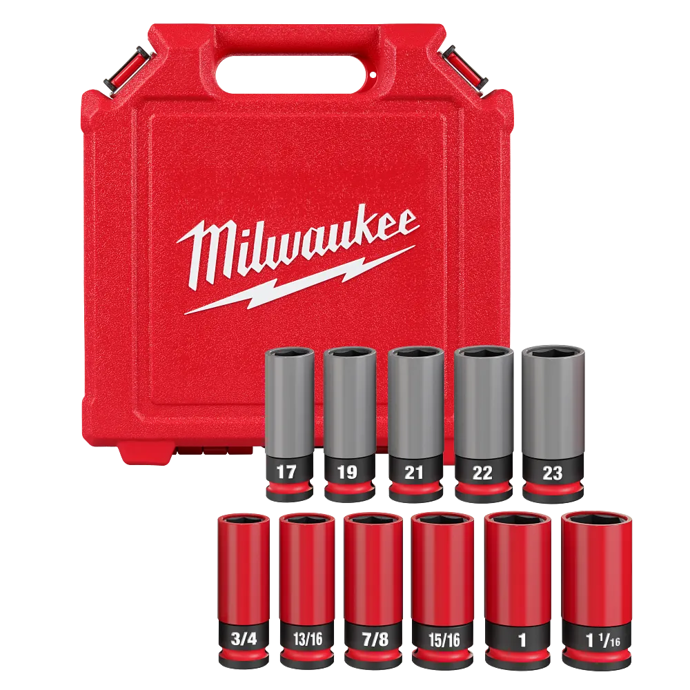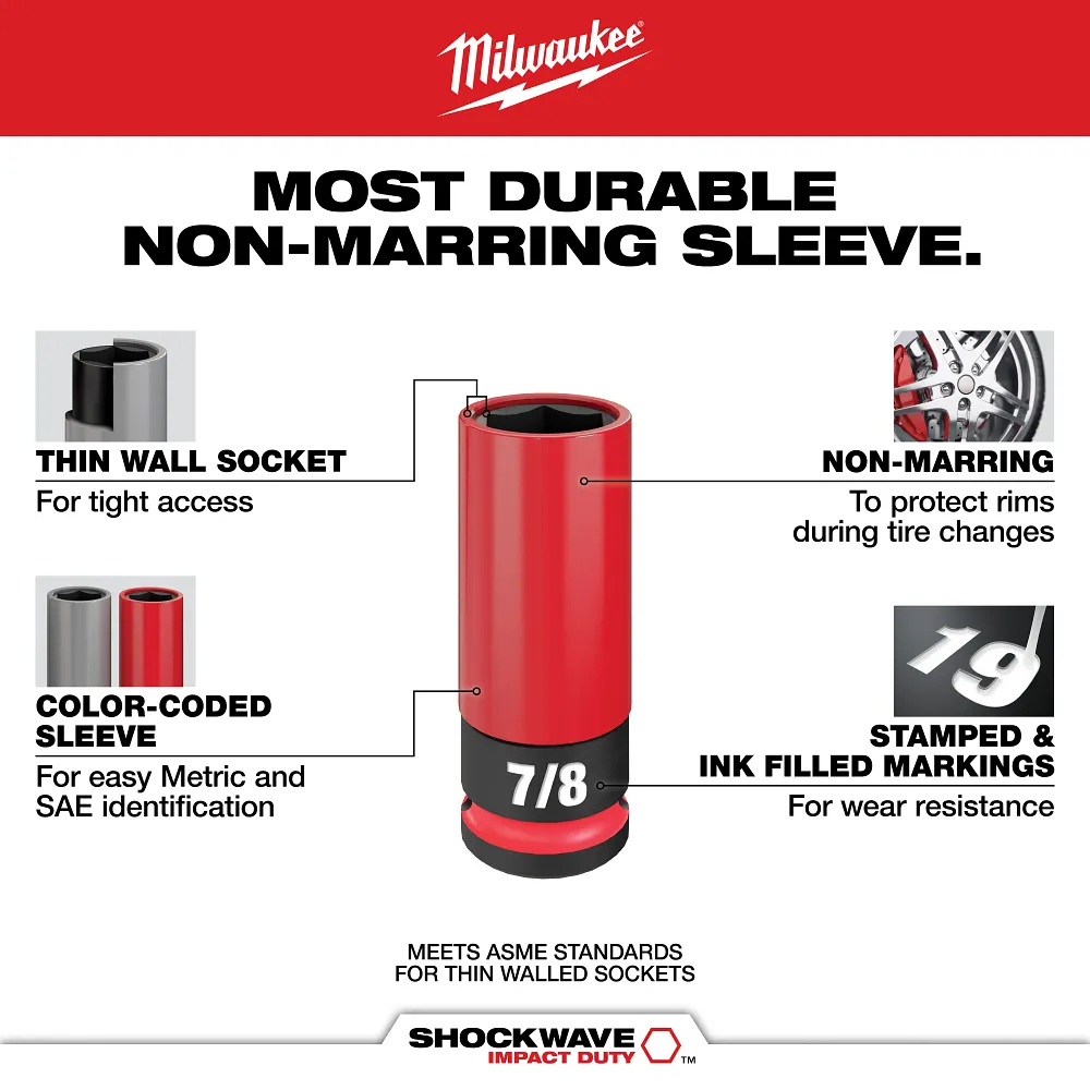 MILWAUKEE® SHOCKWAVE Impact Duty™ 1/2 Drive 6 Point Lug Nut Wheel Sockets features the Most Durable, Non-Marring Sleeve to protect rims during tire changes. The ARMOR-GUARD™ Sleeve is made with premium, durable plastic for Lasting Protection against cracking or shredding during wheel installation and removals. The sockets are thin-walled for easy access in tight wheel assemblies and feature a non-marring plastic insert to protect lug nuts during use. The sleeves are color-coded, Gray for Metric sizes and Red for SAE sizes, to ensure easier socket selection while also featuring stamped & ink filled sizes for the Boldest, Longest Lasting markings. These sockets are engineered with high strength forged steel for optimized performance in heavy-duty applications. The dual-hole design and ring groove allow for easy socket attachment and removal. MILWAUKEE® SHOCKWAVE Impact Duty™ Lug Nut Wheel Sockets are optimized for use with 1/2″ drive impact wrenches, drivers, ratchets, and adapters and meet industry standards for thin-walled sockets.