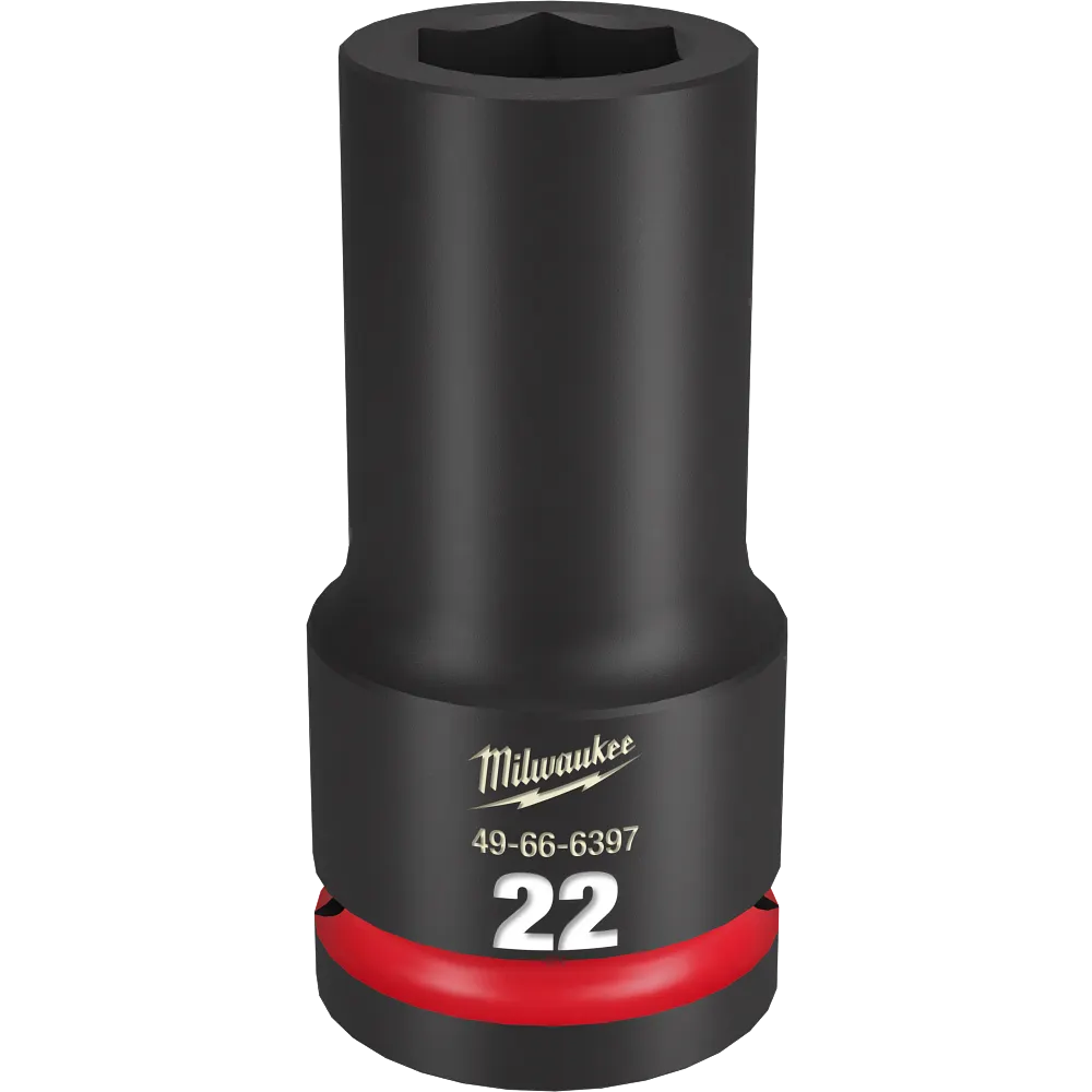 The MILWAUKEE® SHOCKWAVE Impact Duty™ 3/4″ Drive 22MM Deep 6 Point Socket features the boldest, longest-lasting markings and extreme impact durability in high torque applications. The stamped and ink-filled size marking enables an accurate socket selection every time throughout the life of the socket. Engineered with high-strength forged steel for optimized performance in heavy-duty applications, and a non-slip hex geometry prevents fastener rounding. The dual-hole design and ring groove allow for easy socket attachment and removal. All SHOCKWAVE Impact Duty™ Sockets are backed by a Lifetime Guarantee and meet ASME industry standards. Compatible with optional Retaining Ring (49-66-6744).