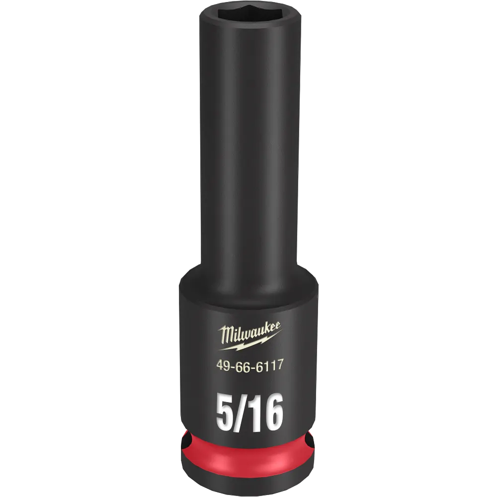 The MILWAUKEE® SHOCKWAVE Impact Duty™ 3/8″ Drive 5/16″ Deep 6 Point Socket features the boldest, longest-lasting markings and extreme impact durability in high torque applications. The stamped and ink-filled size marking enables an accurate socket selection every time throughout the life of the socket. Engineered with high-strength forged steel for optimized performance in heavy-duty applications, and a non-slip hex geometry prevents fastener rounding. The dual-hole design and ring groove allow for easy socket attachment and removal. All SHOCKWAVE Impact Duty™ Sockets are backed by a Lifetime Guarantee and meet ASME industry standards.